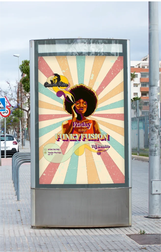 I used an attractive colour palette specific to the entertainment area, futuristic shapes, airy and modern layout.
